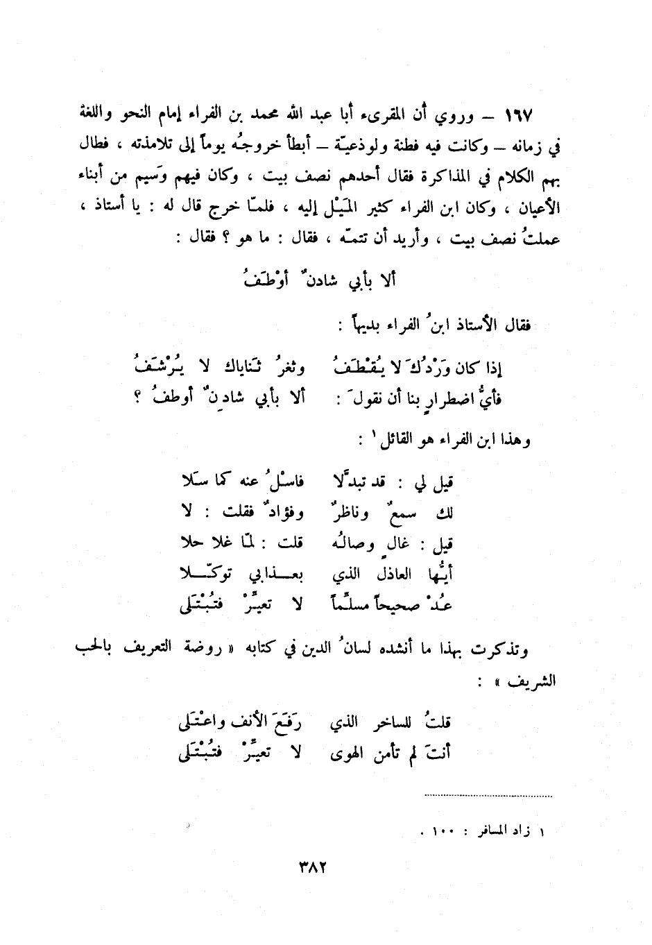 167 - وروي أن المقرئ أبا عبد الله محمد بن الفراء إمام النحو واللغة في زمانه - وكانت فيه فطنة ولوذعية - أبطأ خروجه يوماً إلى تلامذته، فطال بهم الكلام في المذاكرة فقال أحدهم نصف بيت، وكان فيهم وسيم من أبناء الأعيان، وكان ابن الفراء كثير الميل إليه، فلما خرج قال له: يا أستاذ، علمت نصف بيت، وأريد أن تتمه، فقال ما هو فقال: