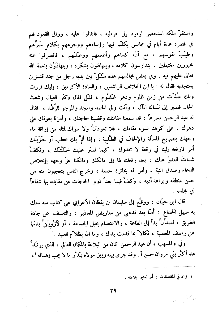 قال ابن حيان: ووقع إلى سليمان بن يقظان الأعرابي على كتاب منه سلك به سبيل الخداع: أما بعد فدعني من معاريض المعاذير، والتعسف عن جادة الطريق، لتمدن يداً إلى الطاعة، والاعتصام بحبل الجماعة، أو لأزوين بنانها عن رصف المعصية، نكالاً بما قدمت يداك، وما الله بظلام للعبيد.