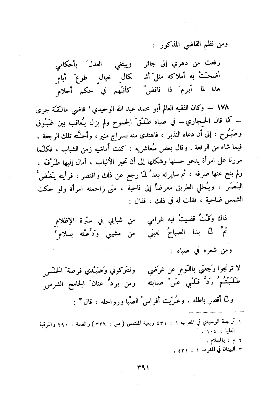 هذا لما أبرم ذا ناقضٌ ... كأنّهم في حكم أحلام 178 - وكان الفقيه العالم أبو محمد عبد الله الوحيدي (1) قاضي مالقة جرى - كما قال الحجاري - في صباه طلق الجموح ولم يزل يعاقب بين غبوق وصبوح، إلى أن دعاه النذير، فاهتدى منه بسراج منير، وأحلته تلك الرجعة، فيما شاء من الرفعة. وقال بعض معاشريه: كنت أماشيه زمن الشباب، فكلما مررنا على امرأة يدعو حسنها وشكلها إلى أن تحير الألباب، أمال إليه طرفه، ولم ينح عنها صرفه، ثم سايرته بعد لما رجع عن ذلك واقتصر، فرأيته يغض البصر، ويخلي الطريق معرضاً إلى ناحية، متى زاحمته امرأة ولو حكت الشمس ضاحية، فقالت له في ذلك، فقال: