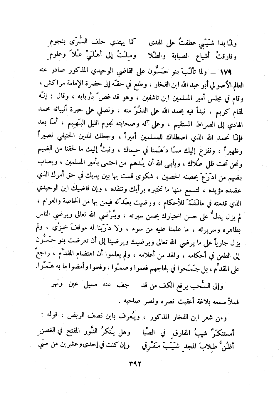 وفارقت أشياع الصبابة والطّلا ... وملت إلى أهلي علاً وعلوم 179 - ولما تألب بنو حسون على القاضي الوحيدي المذكور صادر عنه العالم الأصولي أبو عبد الله ابن الفخار، وطلع في حقه إلى حضرة الإمامة مراكش، وقام في مجلس أمير المسلمين ابن تاشفين، وهو قد غص بأربابه، وقال: إنه لمقام كريم، نبدأ فيه بحمد الله على الدنو منه، ونصلي على خيرة أنبيائه محمد الهادي إلى الصراط المستقيم، وعلى آله وصحابته نجوم الليل البهيم، أما بعد فإنا نحمد الله الذي اصطفاك للمسلمين أميراً، وجعلك للدين الحنيف نصيراً وظهيراً، ونفزع إليك مما دهمنا في حماك، ونبث إليك ما لحقنا من الضيم ونحن تحت ظل علاك، ويأبى الله أن يدهم من احتمى بأمير المسلمين، ويصاب بضيم من ادرع بحصنه الحصين، شكوى قمت بها بين يديك في حق أمرك الذي عضده مؤيده، لتسمع منها ما تختبره برأيك وتنقده، وإن قاضيك ابن الوحيدي الذي قدمته في مالقة للأحكام، ورضيت بعدله فيمن بها من الخاصة والعوام، لم يزل يدل على حسن اختيارك بحسن سيرته، ويرضي الله تعالى ويرضي الناس بظاهره وسريرته، ما علمنا عليه من سوء، ولا درينا له موقف خزي، ولم يزل جارياً على ما يرضي الله تعالى ويرضيك ويرضينا إلى أن تعرضت بنو حسون إلى الطعن في أحكامه، والهد من أعلامه، ةلم يعلموا أن اهتضام المقدم، راجعٌ على المقدم، بل جمحوا في لجاجهم فعموا وصموا، وفعلوا وأمضوا ما به هموا.
