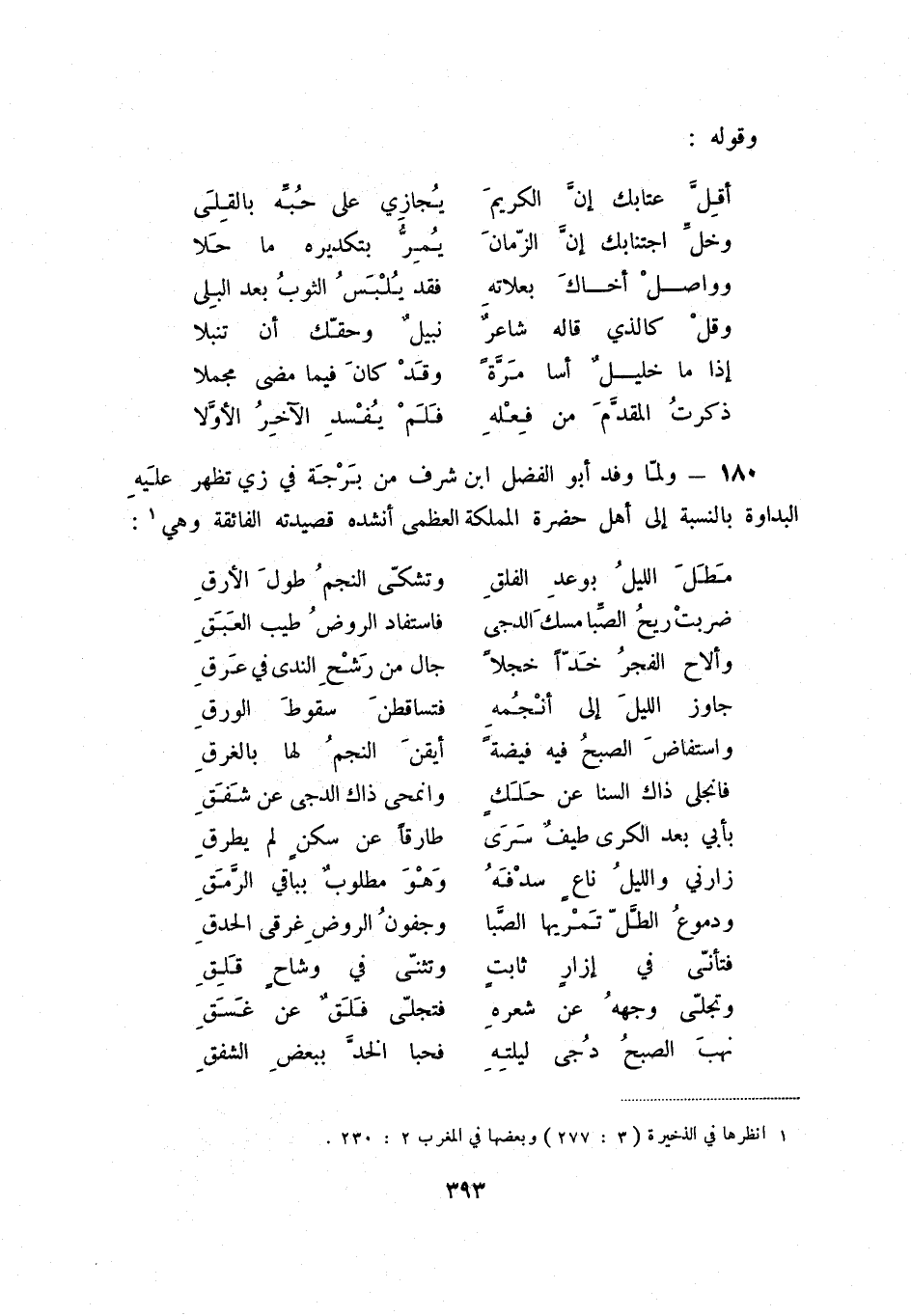 ذكرت المقدّم من فعله ... فلم يفسد الآخر الأولا 180 - ولما وفد أبو الفضل ابن شرف من برجة في زي تظهر عليه البداوة بالنسبة إلى أهل حضرة المملكة العظمى أنشده قصيدته الفائقة وهي (1) :