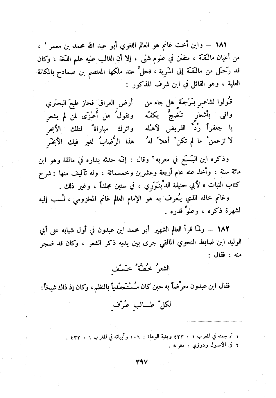 182 - ولما قرأ العالم الشهير أبو محمد ابن عبدون في أول شبابه على أبي الوليد ابن ضابط النحوي المالقي جرى بين يديه ذكر الشعر، وكان قد ضجر منه، فقال: