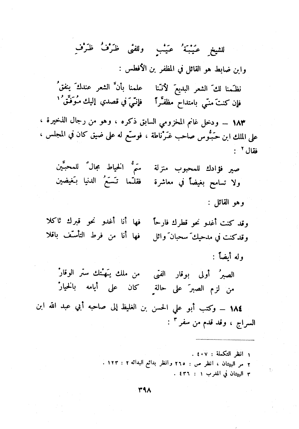 من لزم الصبر على حالةٍ ... كان على أيامه بالخيار 184 - وكتب أبو علي الحسن بن الغليظ إلى صاحبه أبي عبد الله ابن السراج، وقد قدم من سفر (3) :