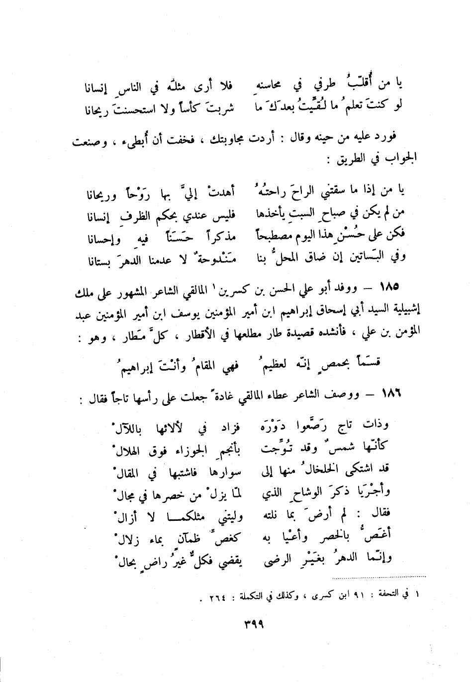 قسماً بحمصٍ إنّه لعظيم ... فهي المقام وأنت إبراهيم 186 - ووصف الشاعر عطاء المالقي غادةً جعلت على رأسها تاجاً فقال: