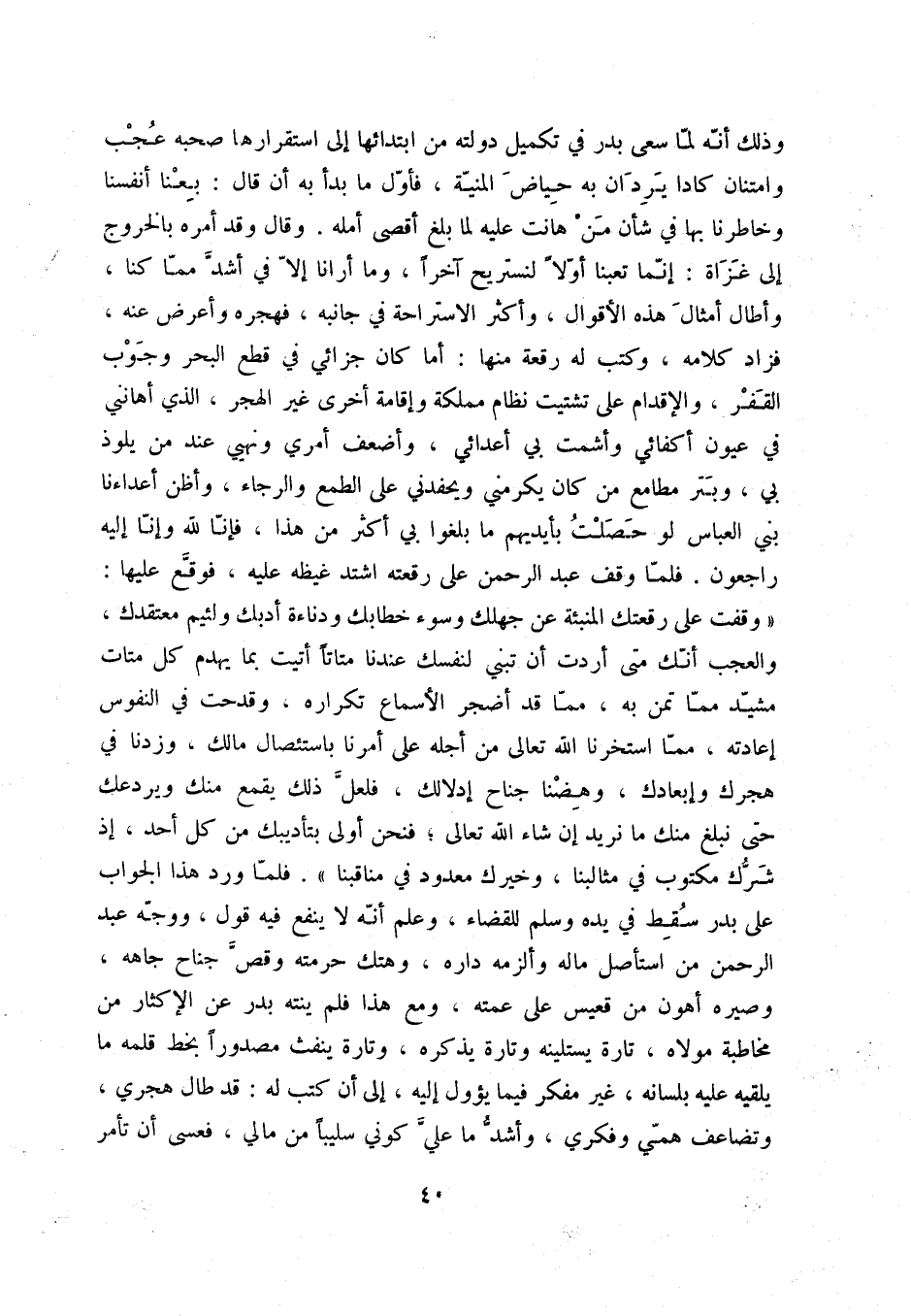 وذلك أنه لما سعى بدر في تكميل دولته من ابتدائها إلى استقرارها صحبه عجب وامتنان كادا يردان به حياض المنية، فأول ما بدأ به أن قال: بعنا أنفسنا وخاطرنا بها في شأن من هانت عليه لما بلغ أقصى أمله. وقال وقد أمره بالخروج إلى غزاة: إنما تعبنا أولاً لنستريح آخراً، وما أرانا إلا في أشدّ مما كنا، وأطال أمثال هذه الأقوال، وأكثر الإستراحة في جانبه، فهجره وأعرض عنه، فزاد كلامه، وكتب له رقعة منها: أما كان جزائي في قطع البحر وجوب القفر، والإقدام على تشتيت نظام مملكة وإقامة أخرى غير الهجر، الذي أهانني في عيون أكفائي وأشمت بي أعدائي، وأضعف أمري ونهيي عند من يلوذ بي، وبتر مطامع من كان يكرمني ويحفدني على الطمع والرجاء، وأظن أعداءنا بني العباس لو حصلت بأيديهم ما بلغوا بي أكثر من هذا، فإنا لله وإنا إليه راجعون. فلما وقف عبد الرحمن على رقعته اشتد غيظه عليه، فوقّع عليها: " وقفت على رقعتك المنبئة عن جهلك وسوء خطابك ودناءة أدبك ولئيم معتقدك، والعجب أنك متى أردت أن تبني لنفسك عندنا متاتاً أتيت بما يهدم كل متات مشيد مما تمن به، مما قد أضجر الأسماع تكراره، وقدحت في النفوس إعادته، مما استخرنا الله تعالى من أجله على أمرنا باستئصال مالك، وزدنا في هجرك وإبعادك، وهضنا جناح إدلالك، فلعل ذلك يقمع منك ويردعك حتى نبلغ منك ما نريد إن شاء الله تعالى؛ فنحن أولى بتأديبك من كل أحد، إذ شرّك مكتوب في مثالبنا، وخيرك معدود في مناقبنا ". فلما ورد هذا الجواب على بدر سقط في يده وسلم للقضاء، وعلم أنه لا ينفع فيه قول، ووجه عبد الرحمن من استأصل ماله وألزمه داره، وهتك حرمته وقص جناح جاهه، وصيره أهون من قعيس على عمته، ومع هذا فلم ينته بدر عن الإكثار من مخاطبة مولاه، تارة يستلينه وتارة يذكره، وتارة ينفث مصدوراً بخط قلمه ما يلقيه عليه بلسانه، غير مفكر فيما يؤول إليه، إلى أن كتب له: قد طال هجري، وتضاعف همي وفكري، وأشد ما عليّ كوني سليباً من مالي، فعسى أن تأمر