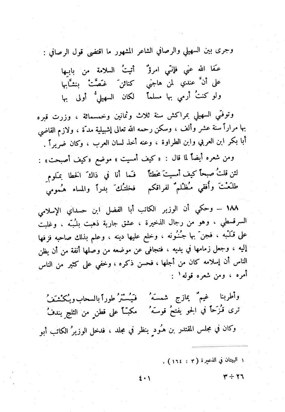 طلعت وأفقي مظلمٌ لفراقكم ... فخلتك بدراً والمساء همومي 188 - وحكي أن الوزير الكاتب أبا الفضل ابن حسداي الإسلامي السرقسطي، وهو من رجال الذخيرة، عشق جاريةً ذهبت بلبه، وغلبت على قلبه، فجن به جنونه، وخلع عليها دينه، وعلم بذلك صاحبه فزفها إليه، وجعل زمامها في يديه، فتجافى عن موضعه من وصلها أنفة من أن يظن الناس أن إسلامه كان من أجلها، فحسن ذكره، وخفي على كثير من الناس أمره، ومن شعره قوله (1) :