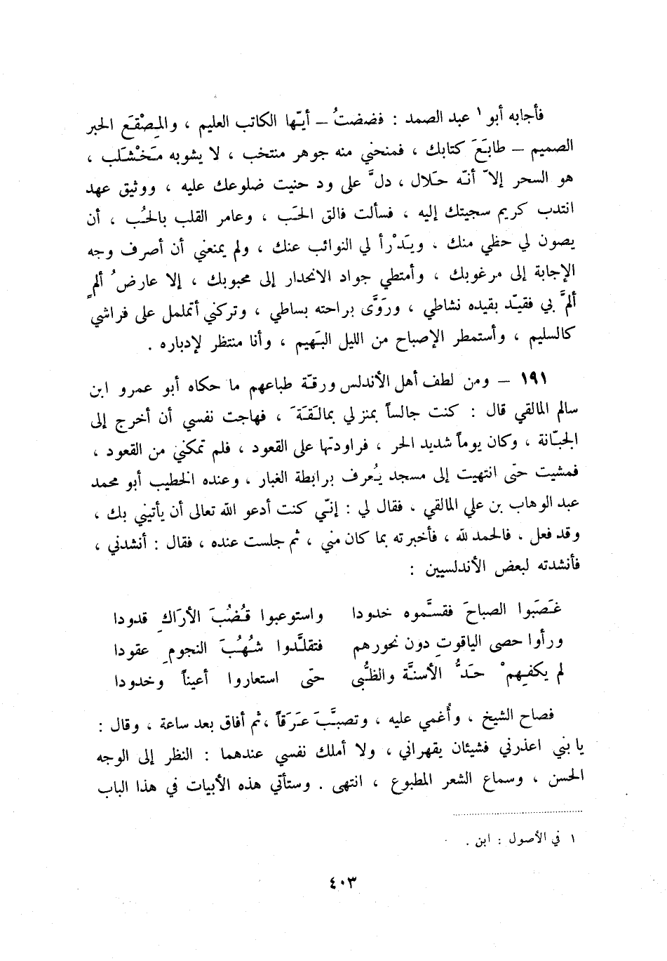 191 - ومن لطف أهل الأندلس ورقة طباعهم ما حكاه أبو عمرو ابن سالم المالقي قال: كنت جالساً بمنزلي بمالقة، فهاجت نفسي أن أخرج إلى الجبانة، وكان يوماً شديد الحر، فراودتها على القعود، فلم تمكني من القعود، فمشيت حتى انتهيت إلى مسجد يعرف برابطة الغبار، وعنده الخطيب أبو محمد عبد الوهاب بن علي المالقي، فقال لي: إني كنت أدعوا الله تعالى أن يأتيني بك، وقد فعل، فالحمد لله، فأخبرته بما كان مني، ثم جلست عنده، فقال: أنشدني، فأنشدته لبعض الأندلسيين: