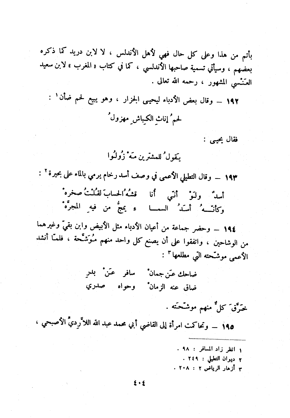 وكأنّه أسد السما ... ء يمجّ من فيه المجرّه 194 - وحضر جماعة من أعيان الأدباء مثل الأبيض وابن بقي وغيرهما من الوشاحين، وافقوا على أن يصنع كل واحد منهم موشحة، فلما أنشد الأعمى موشحته التي مطلعها (3) :