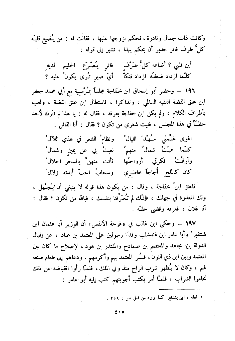 197 - وحكى ابن غالب في " فرحة الأنفس " أن الوزير أبا عثمان ابن شنتفير (1) وأبا عامر ابن غندشلب وفدا رسولين على المعتمد بن عباد، عن إقبال الدولة بن مجاهد والمعتصم بن صمادح والمقتدر بن هود، لإصلاح ما كان بين المعتمد مبين ابن ذي النون، فسر المعتمد بهم وأكرمهم، ودعاهم إلى طعام صنعه لهم، وكان لا يظهر شرب الراح منذ ولي الملك، فلما رأوا انقباضه عن ذلك تحاموا الشراب، فلما أمر بكتب أجوبتهم كتب إليه أبو عامر: