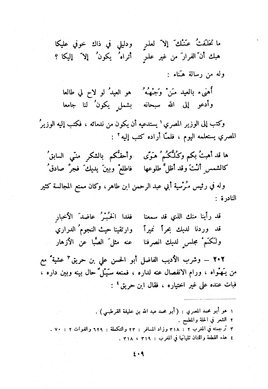 ولكم مجلسٍ لديك انصرفنا ... عنه مثل الصّبا عن الأزهار 202 - وشرب الأديب الفاضل أبو الحسن علي بن حريق (3) عشيةً مع من يهواه، ورام الانفصال عنه لداره، فمنعه سيلٌ حال بينه وبين داره، فبات عنده على غير اختياره، فقال ابن حريق (4) :