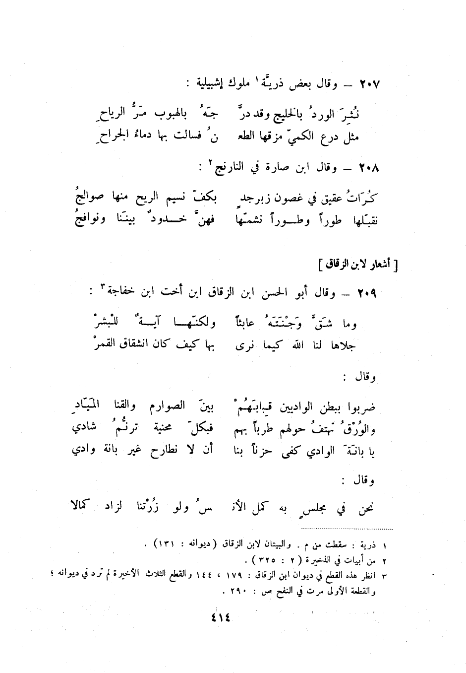(3) انظر هذه القطع في ديوان ابن الزقاق: 179، 144 والقطع الثلاث الأخيرة لم ترد في ديوانه؛ والقطعة الأولى مرت في النفح ص: 290.