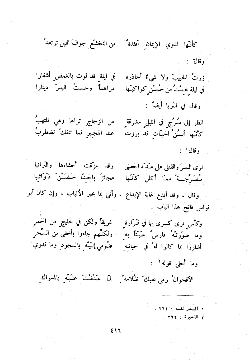 مضرّجةً ممّا أكلن كأنّها ... عجائز بالحنّا خضبن ذوائبا وقال، وقد أبدع غاية الإبداع، وأتى بما يحير الألباب، وإن كان أبو نواس فاتح هذا الباب: