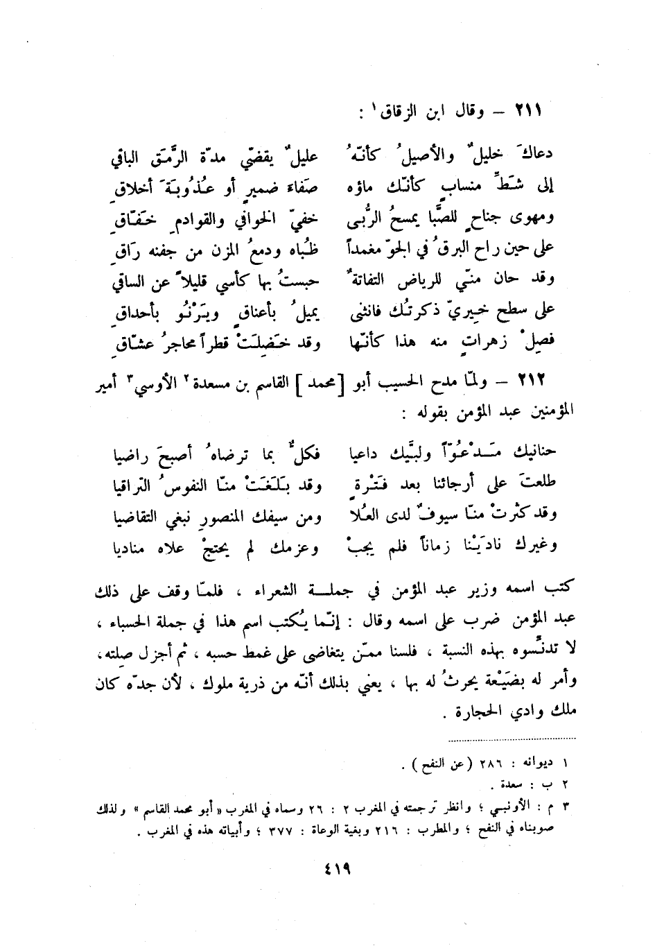 فصل زهراتٍ منه هذا كأنّها ... وقد خضلت قطراً محاجر عشّاق 212 - ولما مدح الحسيب أبو [محمد] القاسم بن مسعدة (2) الأوسي (3) أمير المؤمنين عبد المؤمن بقوله: