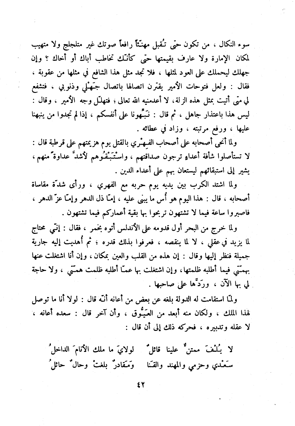 سوء النكال، من تكون حتى تقبل مهنئاً رافعاً صوتك غير متلجلج ولا متهيب لمكان الإمارة ولا عارف بقيمتها حتى كأنك تخاطب أباك أو أخاك وإن جهلك ليحملك على العود لمثلها، فلا تجد مثل هذا الشافع في مثلها من عقوبة، فقال: ولعل فتوحات الأمير يقترن اتصالها باتصال جهلي وذنوبي، فتشفع لي متى أتيت بمثل هذه الزلة، لا أعدمنيه الله تعالى، فتهلل وجه الأمير، وقال: ليس هذا باعتذار جاهل، ثم قال: نبهونا على أنفسكم، إذا لم تجدوا من ينبهنا عليها، ورفع مرتبته، وزاد في عطائه.