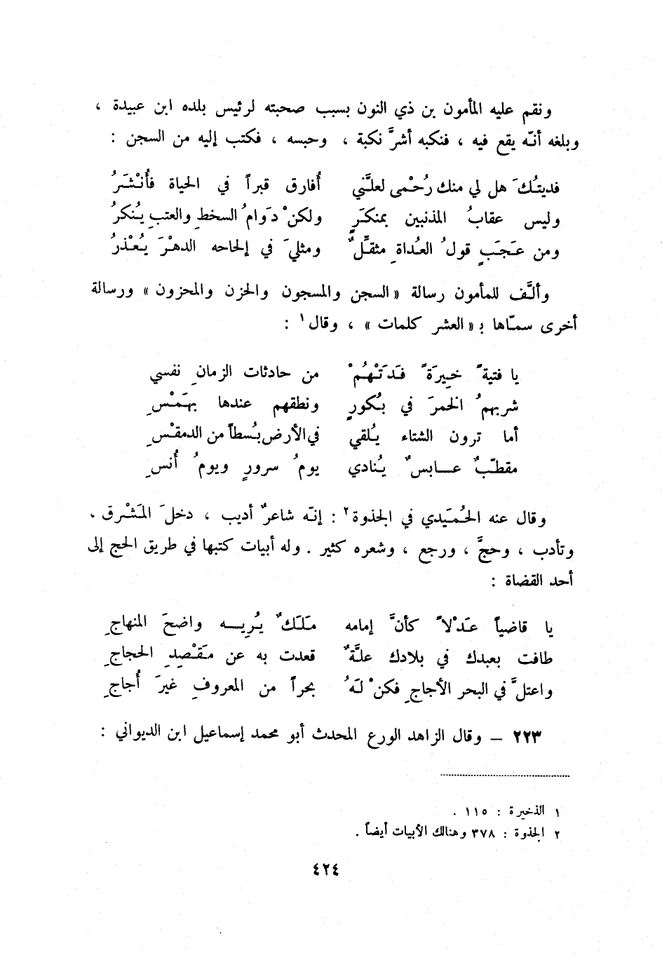 ومن عجبٍ قول العداة مثقّلٌ ... ومثلي في إلحاحه الدهر يعذر وألف للمأمون رسالة " السجن والمسجون والحزن والمحزون " ورسالة أخرى سماها ب " العشر كلمات "، وقال (1) :