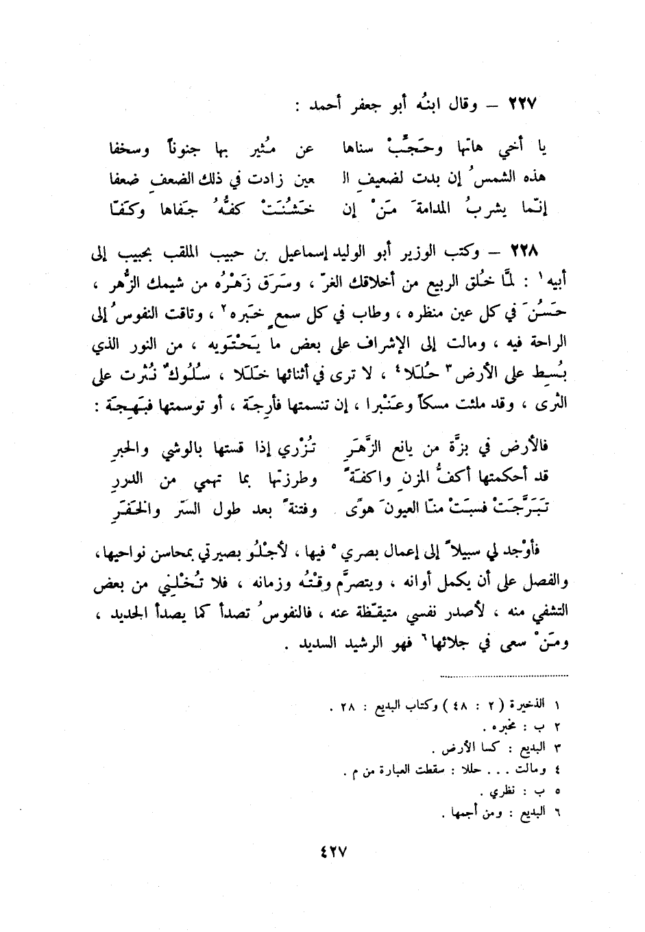 إنّما يشرب المدامة من إن ... خشنت كفّه جفاها وكفّا 228 - وكتب الوزير أبو الوليد إسماعيل بن حبيب الملقب بحبيب إلى أبيه (1) : لما خلق الربيع من أخلاقك الغر، وسرق زهره من شيمك الزهر، حسن في كل عين منظره، وطاب في كل سمعٍ خبره (2) ، وتاقت النفوس إلى الراحة فيه، ومالت إلى الإشراف على بعض ما يحتويه، من النور الذي بسط على الأرض (3) حللا (4) ، لا ترى في أثنائها خللا، سلوكٌ نثرت على الثرى، وقد ملئت مسكاً وعنبرا، إن تنسمتها فأرجة، أو توسمتها فبهجة: