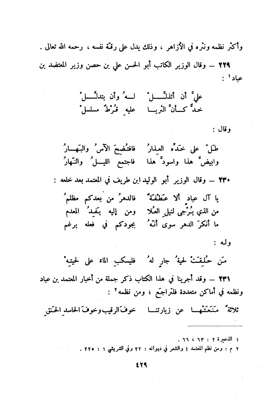 229 - وقال الوزير الكاتب أبو الحسن علي بن حصن وزير المعتضد بن عباد (1) :