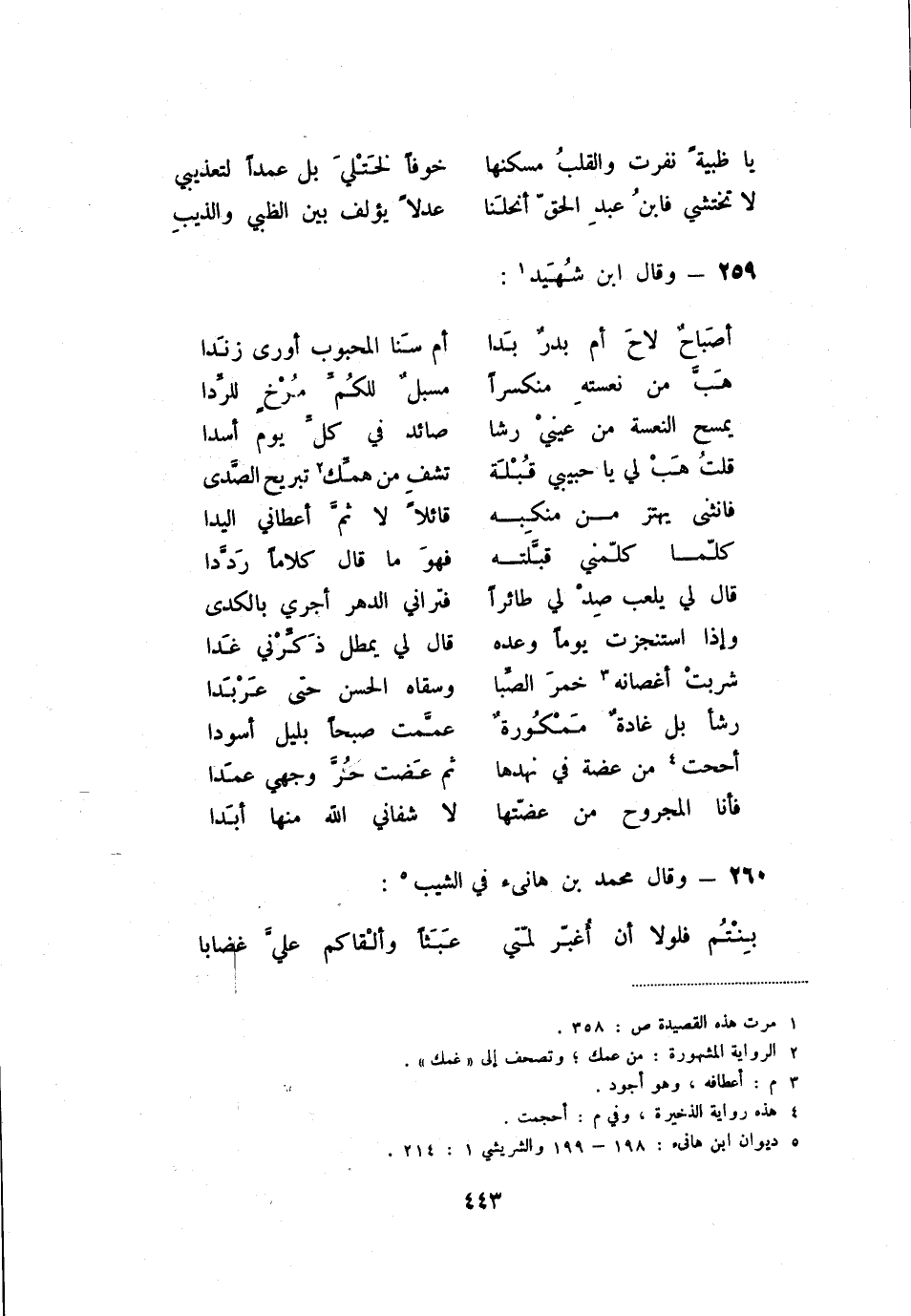 فأنا المجروح من عضّتها ... لا شفاني الله منها أبدا 260 - وقال محمد بن هانئ في الشيب (5) :