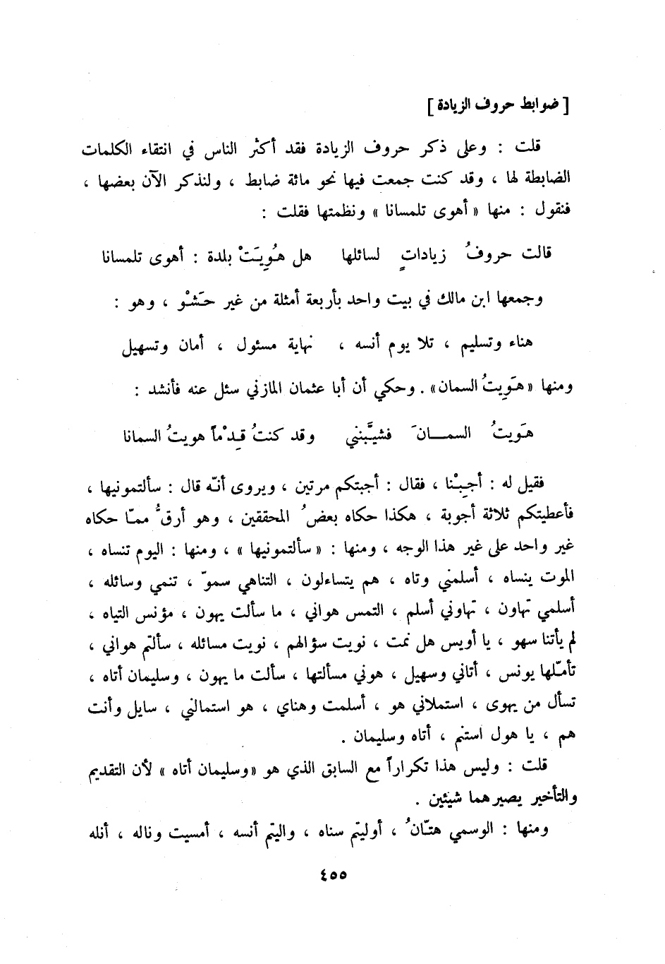 قلت وعلى ذكر حروف الزيادة فقد أكثر الناس في انتقاء الكلمات الضابطة لها، وقد كنت جمعت فيها نحو مائة ضابط، ولنذكر الآن بعضها، فنقول: منها " أهوى تلمسانا " ونظمتها فقلت: