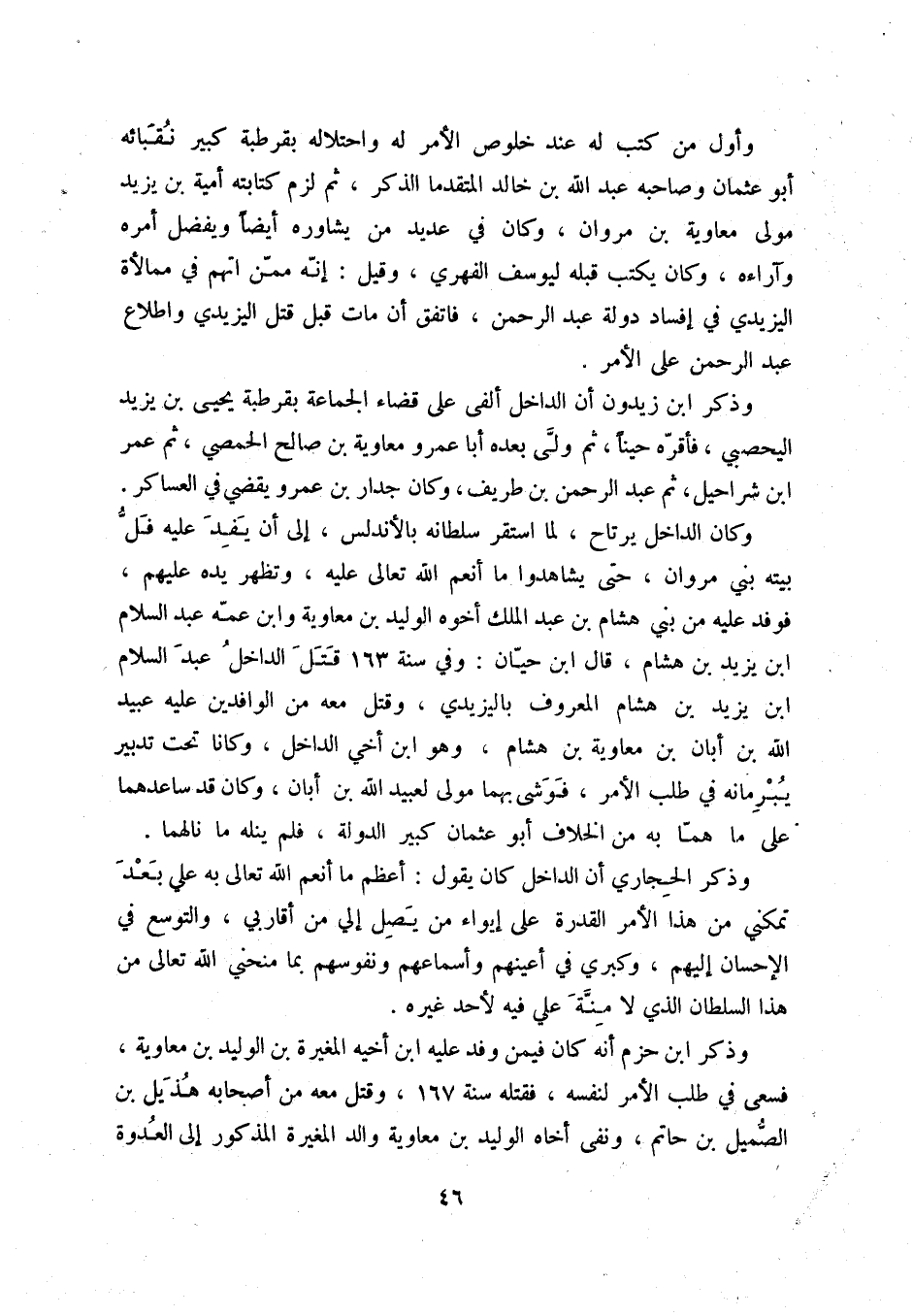 وأول من كتب له عند خلوص الأمر له واحتلاله بقرطبة كبير نقبائه أبو عثمان وصاحبه عبد الله بن خالد المتقدما الذكر، ثم لزم كتابته أمية بن يزيد مولى معاوية بن مروان، وكان في عديد من يشاوره أيضاً ويفضل أمره وآراءه، وكان يكتب قبله ليوسف الفهري، وقيل: إنه ممن اتهم في ممالأة اليزيدي في إفساد دولة عبد الرحمن، فاتقف أن مات قبل قتل اليزيدي واطلاع عبد الرحمن على الأمر.