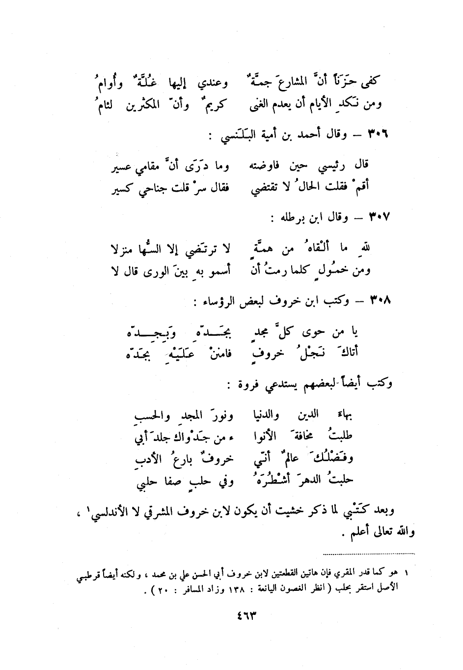 (1) هو كما قدر المقري فإن هاتين القطعتين لابن خروف أبي الحسن علي بن خمد، ولكنه أيضا قرطبي الأصل استقر بحلب (انظر الغصون اليانعة: 138 وزاد المسافر: 20) .