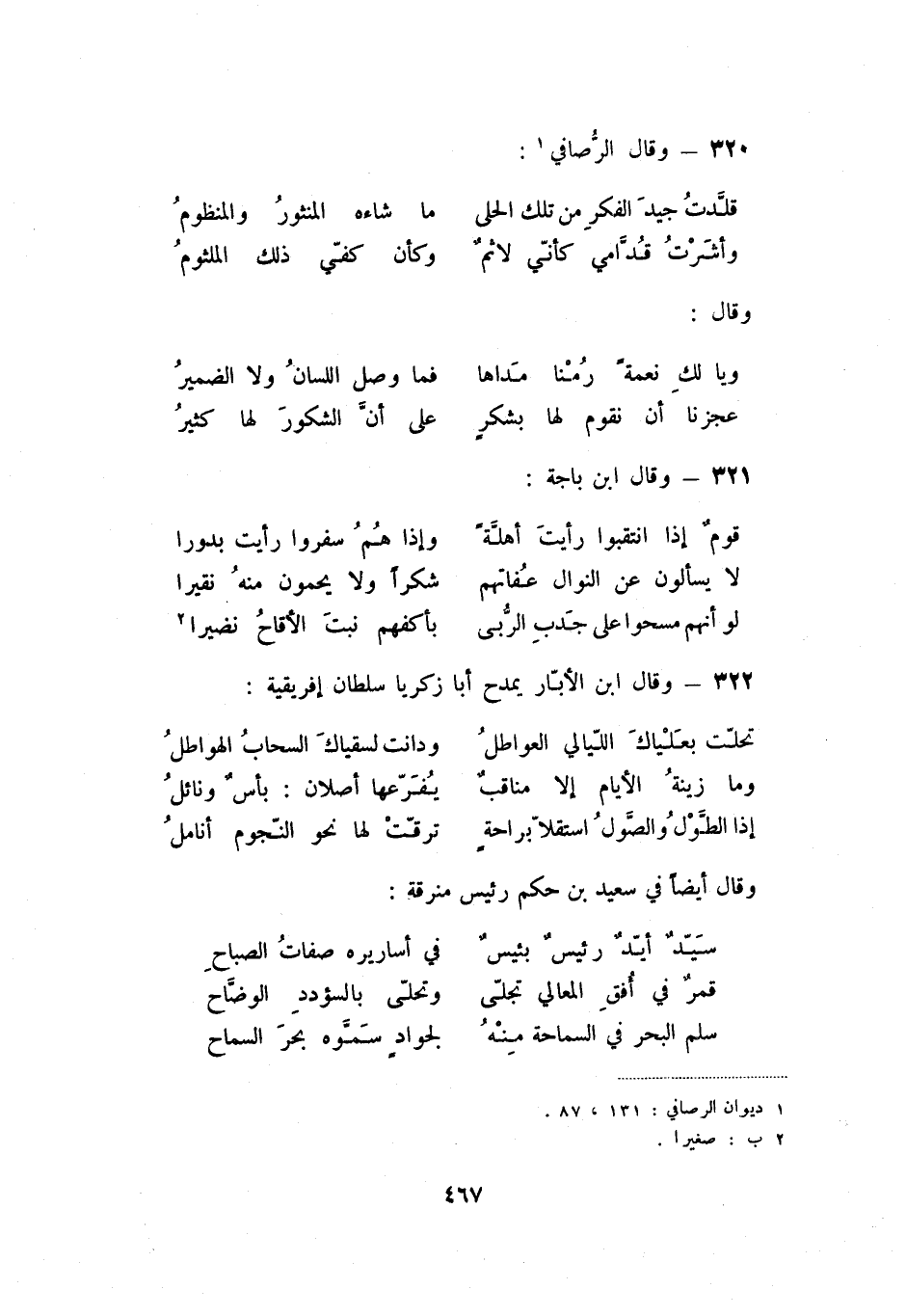 لو أنهم مسحوا على جدب الرّبى ... بأكفهم نبت الأقاح نضيرا (2) 322 - وقال ابن الأبار يمدح أبا زكريا سلطان إفريقية: