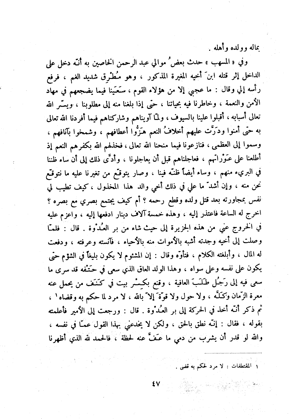 وفي " المسهب " حدث بعض موالي عبد الرحمن الخاصين به أنه دخل على الداخل إثر قتله ابن أخيه المغيرة المذكور، وهو مطرق شديد الغم، فرفع رأسه إليّ وقال: ما عجبي إلا من هؤلاء القوم، سعينا فيما يضجعهم في مهاد الأمن والنعمة، وخاطرنا فيه بحياتنا، حتى إذا بلغنا منه إلى مطلوبنا، ويسّر الله تعالى أسبابه، أقبلوا علينا بالسيوف، ولما آويناهم وشاركناهم فيما أفردنا الله تعالى به حتى أمنوا ودرت عليهم أخلاف النعم هزوا أعطافهم، وشمخوا بآنافهم، وسموا إلى العظمى، فنازعونا فيما منحنا الله تعالى، فخذلهم الله بكفرهم النعم إذ أطلعنا على عوراتهم، فعاجلناهم قبل أن يعاجلونا، وأدى ذلك إلى أن ساء ظننا في البريء منهم، وساء أيضاً ظنه فينا، وصار يتوقع من تغيرنا عليه ما نتوقع نحن منه، وإن أشد ما علي في ذلك أخي والد هذا المخذول، كيف تطيب لي نفسٌ بمجاورته بعد قتل ولده وقطع رحمه أم كيف يجتمع بصري مع بصره اخرج له الساعة فاعتذر إليه، وهذه خمسة آلاف دينار ادفعها إليه، واعزم عليه في الخروج عني من هذه الجزيرة إلى حيث شاء من بر العدوة. قال: فلما وصلت إلى أخيه وجدته أشبه بالأموات منه بالأحياء، فآنسته وعرفته، ودفعت له المال، وأبلغته الكلام، فتأوه وقال: إن المشئوم لا يكون بليغاً في الشؤم حتى يكون على نفسه وعلى سواه، وهذا الولد العاق الذي سعى في حتفه قد سرى ما سعى فيه إلى رجل طلب العافية، وقنع بكسر بيت في كنف من يحمل عنه معرة الزمان وكله، ولا حول ولا قوة إلا بالله، لا مرد لما حكم به وقضاه (1) ، ثم ذكر أنه أخذ في الحركة إلى بر العدوة. قال: ورجعت إلى الأمير فأعلمته يقوله، فقال: إنه نطق بالحق، ولكن لا يخدعني بهذا القول عما في نفسه، والله لو قدر أن يشرب من دمي ما عف عنه لحظة، فالحمد لله الذي أظهرنا