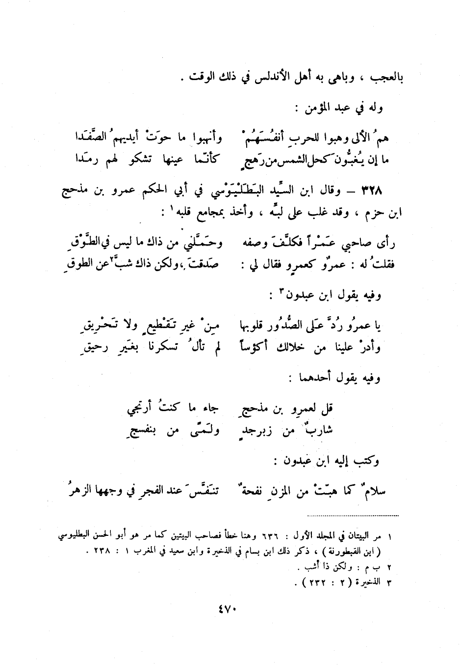 (1) مر البيتان في المجلد الأول: 636 وهنا خطأ فصاحب البيتين كما هو أبو الحسن البطليوسي (ابن القبطورنة) ، ذكر ذلك ابن بسام في الذخيرة وابن سعيد في المغرب 1: 238.