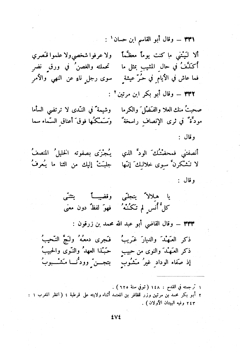 (2) أبو بكر محمد بن مرتين وزر للظافر بن المعتمد أثناء ولايته على قرطبة؛ (انظر المغرب 1: 234 وفيه البيتان الأولان) .