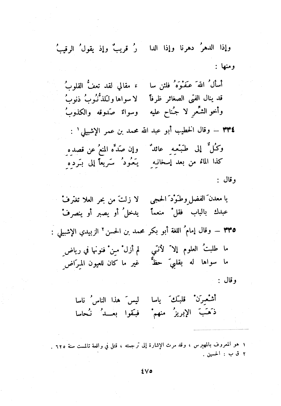 عبدك بالباب فقل منعماً ... يدخل أو يصبر أو ينصرف 335 - وقال إمام اللغة أبو بكر محمد بن الحسن (2) الزبيدي الإشبيلي: