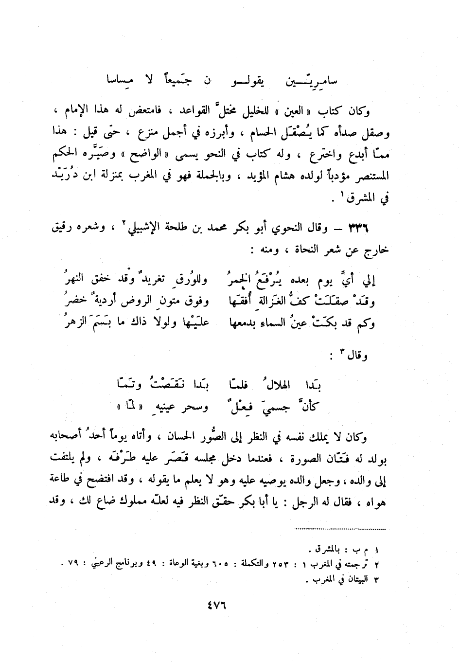 336 - وقال النحوي أبو بكر محمد بن طلحة الإشبيلي (2) ، وشعره رقيق خارج عن شعر النحاة، ومنه: