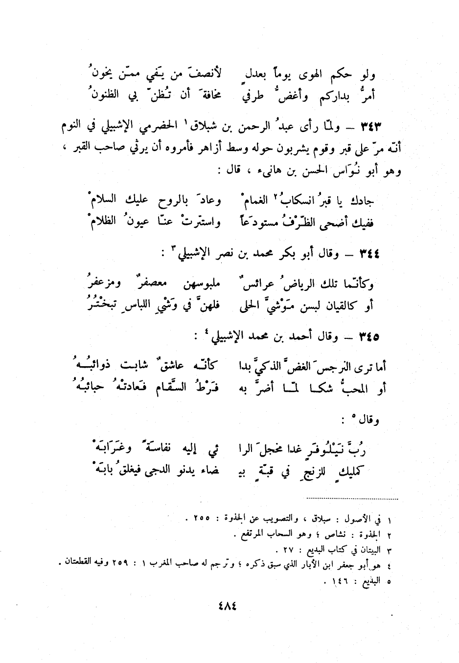 أمرّ بداركم وأغضّ طرفي ... مخافة أن تظنّ بي الظنون 343 - ولما رأى عبد الرحمن بن شبلاق (1) الحضرمي الإشبيلي في النوم أنه مر على قبرٍ وقوم يشربون حوله وسط أزاهر فأمروه أن يرثي صاحب القبر، وهو أبو نواس الحسن بن هانئ، قال: