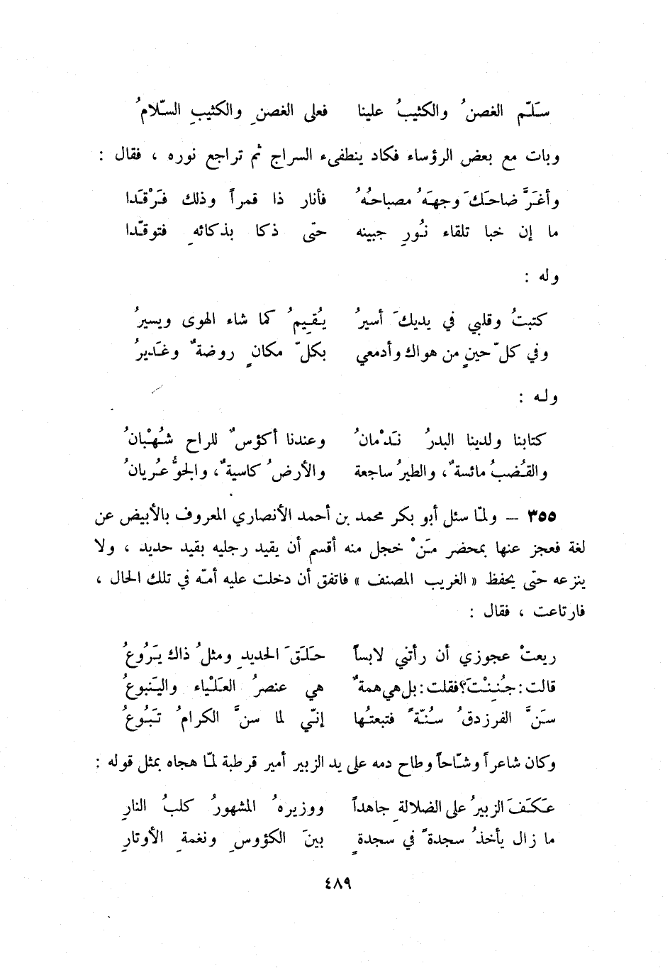 والقضب مائسةٌ، والطير ساجعة ... والأرض كاسيةٌ، والجوّ عريان 355 - ولما سئل أبو بكر محمد بن أحمد الأنصاري المعروف بالأبيض عن لغة فعجز عنها بمحضر من خجل منه أقسم أن يقيد رجليه بقيد حديد، ولا ينزعه حتى يحفظ " الغريب المصنف " فاتفق أن دخلت عليه أمه في تلك الحال، فارتاعت، فقال: