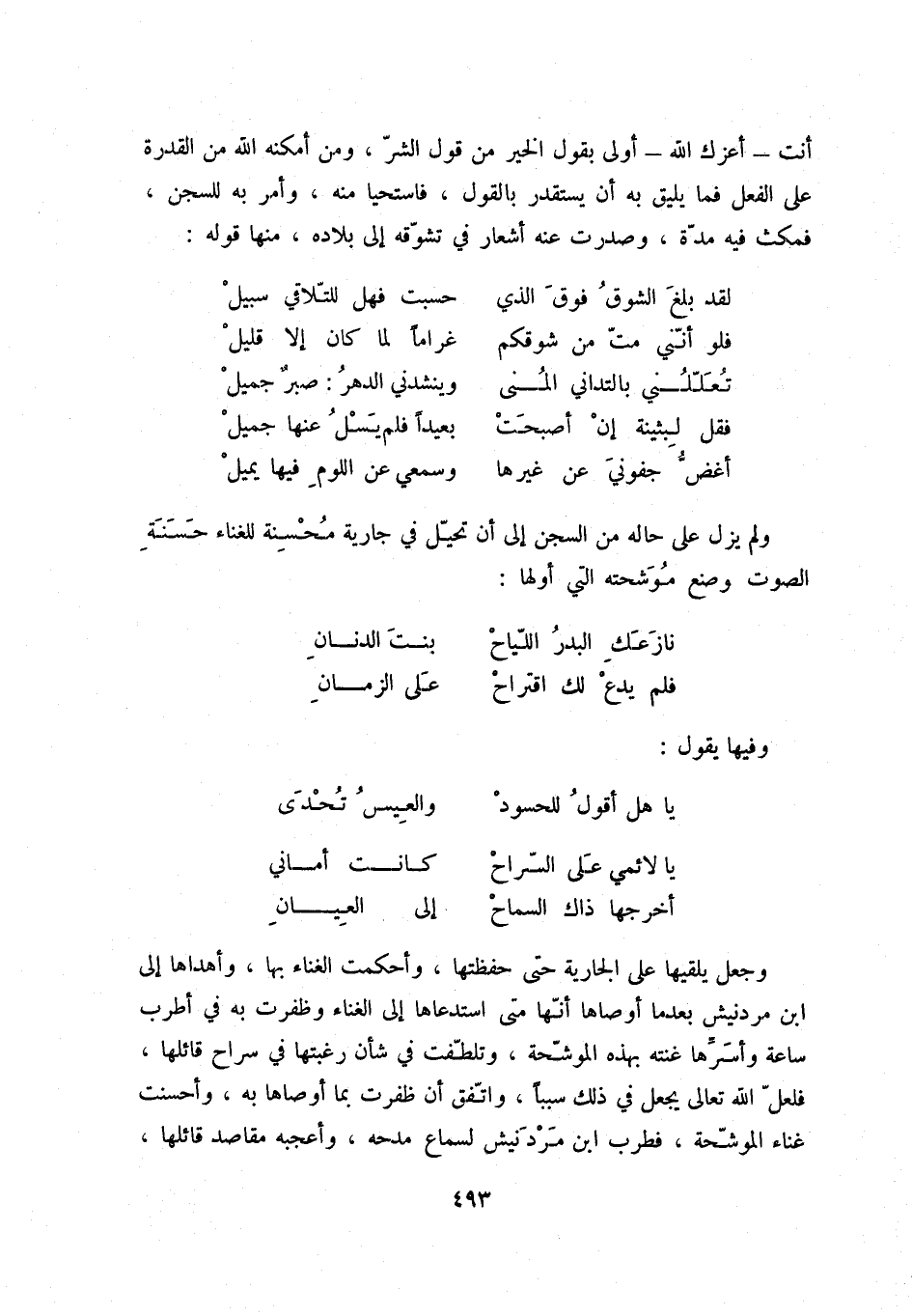 أغضّ جفوني عن غيرها ... وسمعي عن اللوم فيها يميل ولم يزل على حاله من السجن إلى أن تحيّل في جارية محسنة للغناء حسنة الصوت وضع موشحته التي أولها: