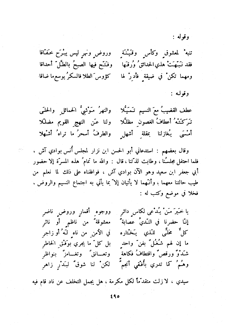 أمسى يغازلنا بمقلة أشهلٍ ... والطرف أسحر ما تراه أشهلا وقال بعضهم: استدعاني أبو الحسن ابن نزار لمجلس بوادي آش، فلما احتفل مجلسنا، وطابت لذتنا، قال: والله ما تمام هذه المسرة إلا حضور أبي جعفر ابن سعيد وهو الآن بوادي آش، فوافقناه على ذلك لما نعلم من طيب حالتنا معهما، وأنهما لا يأتيان إلا بما يأتي به اجتماع النسيم والروض، فخلا في موضع وكتب له:
