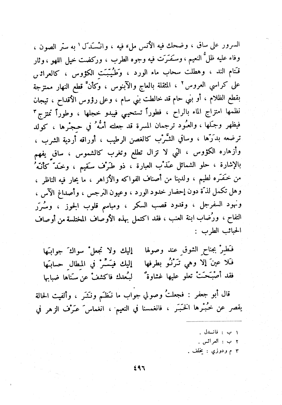 السرور على ساق، وضحك فيه النس ملء فيه، وانسدل (1) به ستر الصون، وفاء عليه ظلّ النعيم، وسفرت فيه وجوه الطرب، وركضت خيل اللهو، وثار قتام الند، وهطلت سحاب ماء الورد، وطيبت الكؤوس، كالعرائس على كراسي العروس (2) ، المثقلة بالعاج والآبنوس، وكأن قطع النهار ممتزجة بقطع الظلام، أو بني حام قد خالطت بني سام، وعلى رؤوس الأقداح، تيجان نظمها امتزاج الماء بالراح، فطوراً تستحيي فيبدو خجلها، وطوراً تمتزج (3) فيظهر وجلها، والعود ترجمان المسرة قد جعلته أمه في حجرها، كولد ترضعه بدرها، وساقي الشرب كالغصن الرطيب، أوراقه أردية الشرب، وأزهاره الكؤوس، التي لا تزال تطلع وتغرب كالشمس، ساقٍ يفهم بالإشارة، حلو الشمائل عذب العبارة، ذو طرف سقيم، وخد كأنه من خفره لطيم، ولدينا من أصناف الفواكه والأزاهر، ما يحار فيه الناظر، وهل تكمل لذة دون إحضار خدود الورد، وعيون النرجس، وأصداغ الآس، ونهود السفرجل، وقدود قصب السكر، ومباسم قلوب اللوز، وسرر التفاح، ورضاب ابنة العنب، فقد اكتمل بهذه الأوصاف المختلسة من أوصاف الحبائب الطرب: