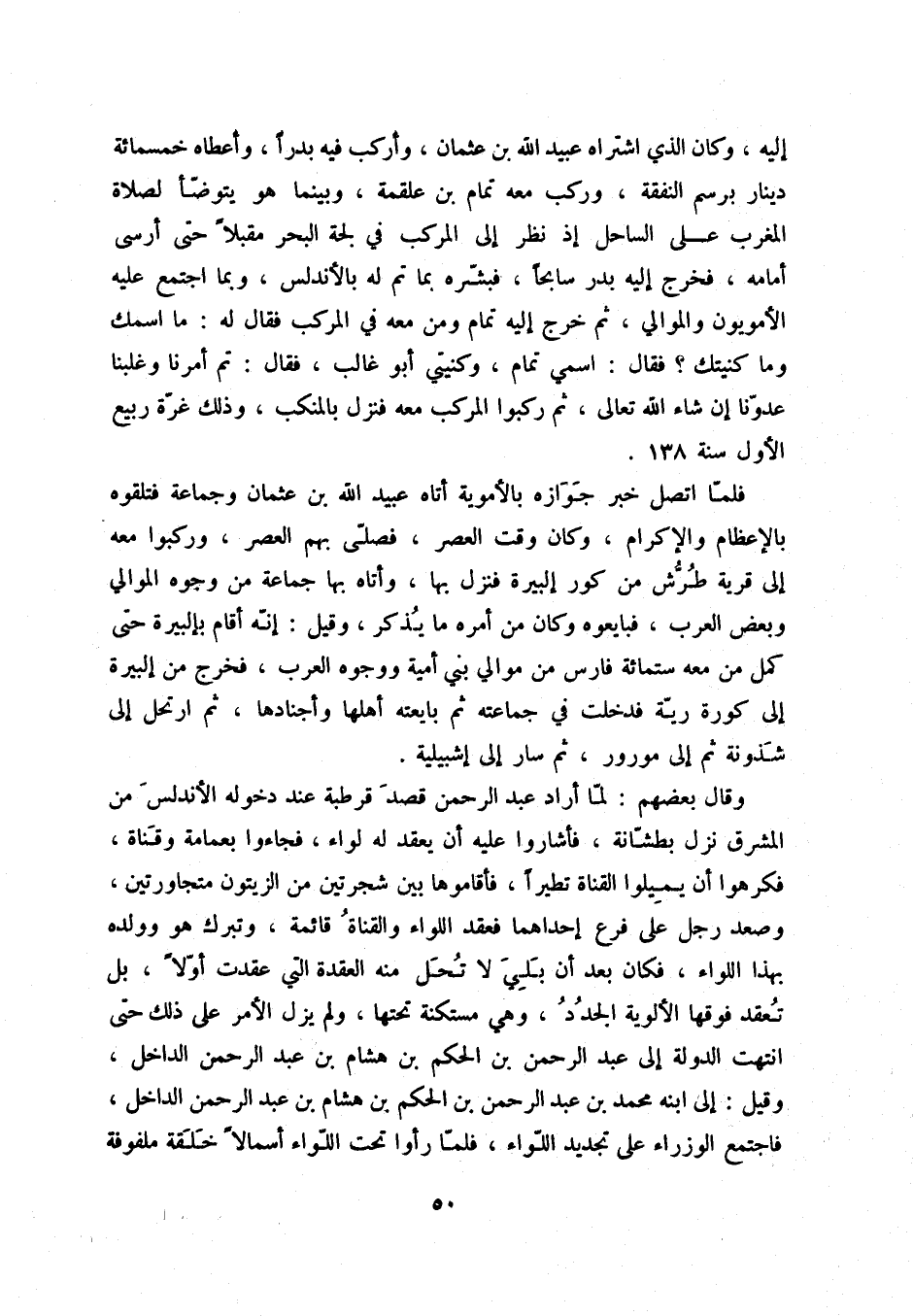 إليه، وكان الذي اشتراه عبيد الله بن عثمان، وأركب فيه بدراً، وأعطاه خمسمائة دينار برسم النفقة، وركب معه تمام بن علقمة، وبينما هو يتوضأ لصلاة المغرب على الساحل إذ نظر إلى المركب في لجة البحر مقبلاً حتى أرسى أمامه، فخرج إليه بدر سابحاً، فبشره بما تم له بالأندلس، وبما اجتمع عليه الأمويون والموالي، ثم خرج إليه تمام ومن معه في المركب فقال له: ما اسمك وما كنيتك فقال: اسمي تمام، وكنيتي أبو غالب، فقال: ثم أمرنا وغلبنا غدوّنا إن شاء الله، ثم ركبوا المركب معه فنزل بالمنكب، وذلك غرّة ربيع الأول سنة 138.