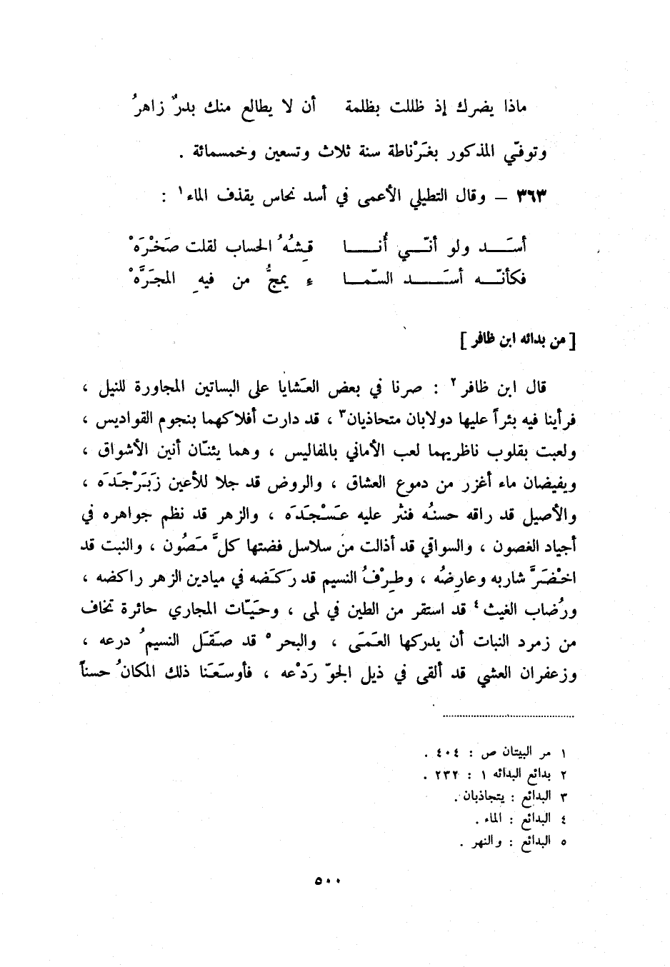 قال ابن ظافر (2) : صرنا في بعض العشايا على البساتين المجاورة للنيل، فرأينا فيه بئراً عليها دولابان متحاذيان (3) ، قد دارت أفلاكهما بنجومالقواديس، ولعبت بقلوب ناظريهما لعب الأماني بالمفاليس، وهما يئنان أنين الأشواق، ويفيضان ماء أغزر من دموع العشاق، والروض قد جلا للأعين زبرجده، والأصيل قد راقه حسنه فنثر عليه عسجده، والزهر قد نظم جواهره في أجياد الغصون، والسواقي قد أذالت من سلاسل فضتها كل مصون، والنبت قد اخضر شاربه وعارضه، وطرف النسيم قد ركضه في ميادين الزهر راكضه، ورضاب الغيث (4) قد استقر من الطين في لمى، وحيات المجاري حائرة تخاف من زمرد النبات أن يدركها العمى، والبحر (5) قد صقل النسيم درعه، وزعفران العشي قد ألقى في ذيل الجو ردعه، فأوسعنا ذلك المكان