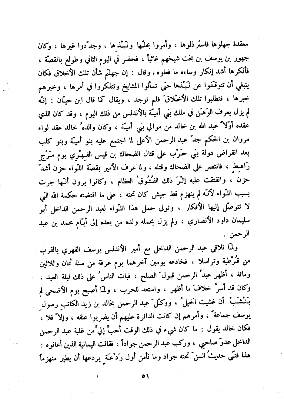 معقدة جهلوها فاسترذلوها، وأمروا بحلها ونبذها، وجددوا غيرها، وكان جهور بن يوسف بن بخت شيخهم غائباً، فحضر في اليوم الثاني وطولع بالقصة، فأنكرها أشد إنكار وساءه ما فعلوه، وقال: إن جهلتم شأن تلك الأخلاق فكان ينبغي أن تتوقفوا عن نبذها حتى تسألوا المشايخ وتتفكروا في أمرها، وخبرهم خبرها، فتطلبوا تلك الأخلاق فلم توجد، ويقال كما قال ابن حيان: إنه لم يزل يعرف الوهن في ملك بني أمية بالأندلس من ذلك اليوم، وقد كان الذي عقده أولاً عبد الله بن خالد من موالي بني أمية، وكان والده خالد عقد لواء مروان بن الحكم جد عبد الرحمن الأعلى لما اجتمع عليه بنو أمية وبنو كلب بعد انقراض دولة بني حرب على قتال الضحاك بن قيس الفهري يوم مرج راهطٍ، فانتصر على الضحاك وقتله، ولما عرف الأمير بقصة اللواء حزن أشد حزن، وانفتقت عليه إثر ذلك الفتوق العظام، وكانوا يرون أنها جرت بسبب اللواء لأنه لم ينهزم قط جيش كان تحته، على ما اقتضته حكمة الله التي لا تتوصل إليها الأفكار، وتولى حمل هذا اللواء لعبد الرحمن الداخل أبو سليمان داود الأنصاري، ولم يزل يحمله ولده من بعده إلى أيام محمد بن عبد الرحمن.