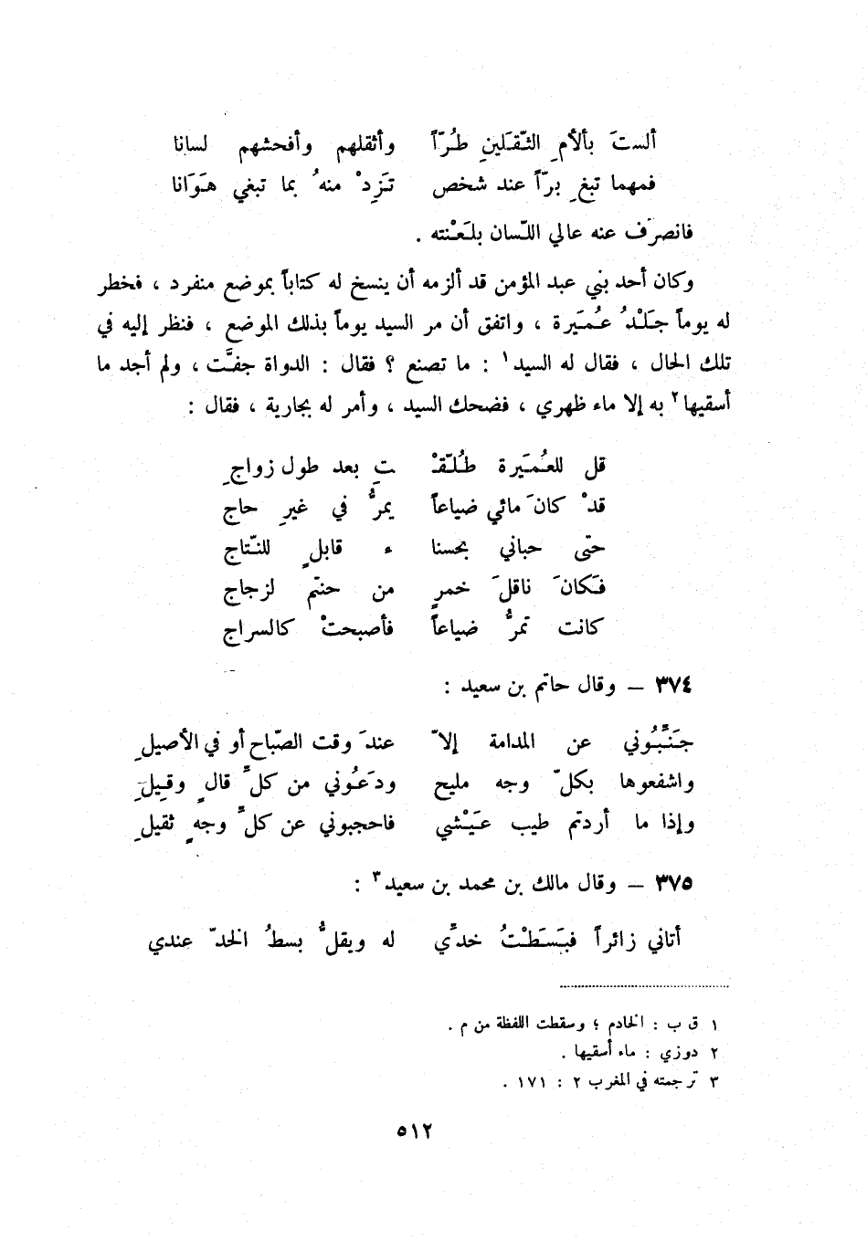 وإذا ماأردتم طيب عيشي ... فاحجبوني عن كلّ وجهٍ ثقيل 375 - وقال مالك بن محمد بن سعيد (3) :