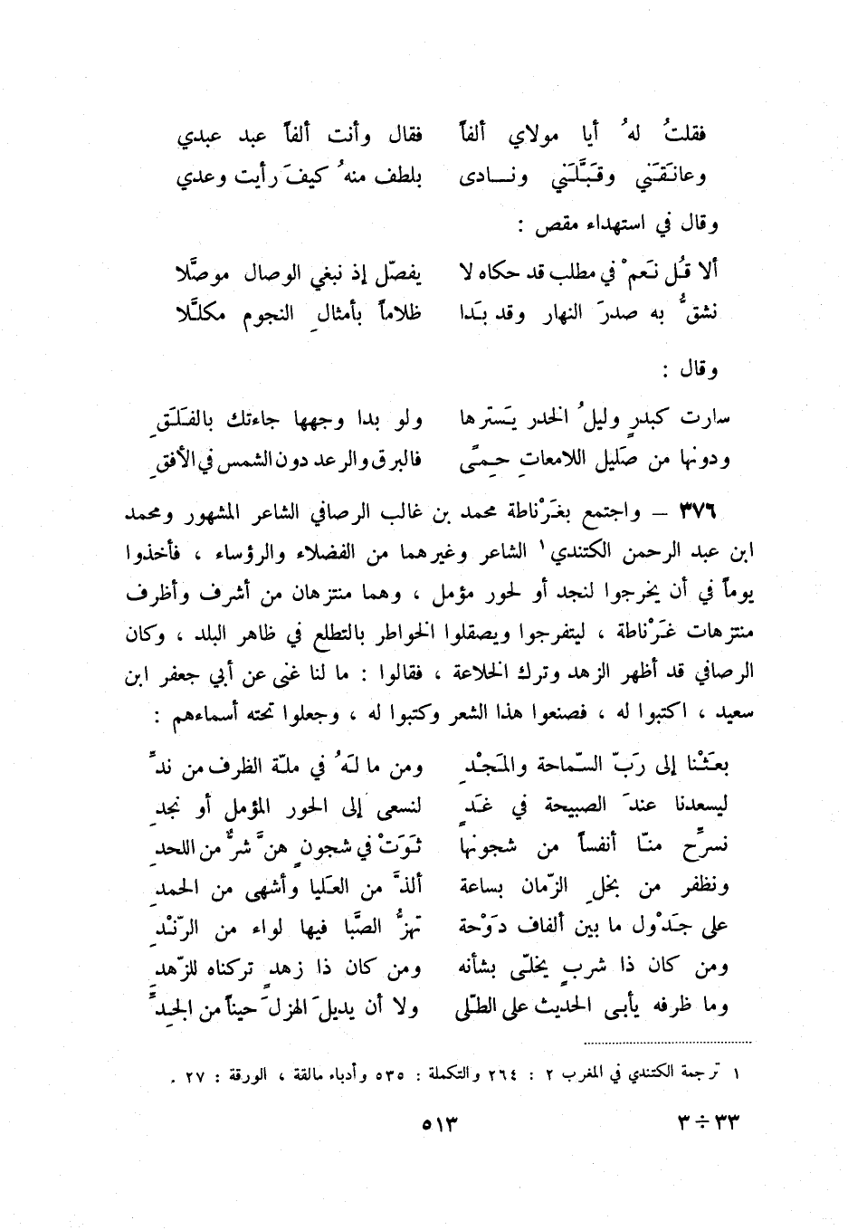 ودونها من صليل اللامعات حمىً ... فالبرق والرعد دون الشمس في الأفق 376 - واجتمع بغرناطة محمد بن غالب الرصافي الشاعر المشهور ومحمد ابن عبد الرحمن الكتندي (1) الشاعر وغيرهما من الفضلاء والرؤساء، فأخذوا يوماً في أن يخرجوا لنجد أو لحور مؤمل، وهما منتزهان من أشرف وأظرف منتزهات غرناطة، ليتفرجوا ويصقلوا الخواطر بالتطلع في ظاهر البلد، وكان الرصافي قد أظهر الزهد وترك الخلاعة، فقالوا: ما لنا غنى عن أبي جعفر ابن سعيد، اكتبوا له، فصنعوا هذا الشعر وكتبوا له، وجعلوا تحته أسماءهم: