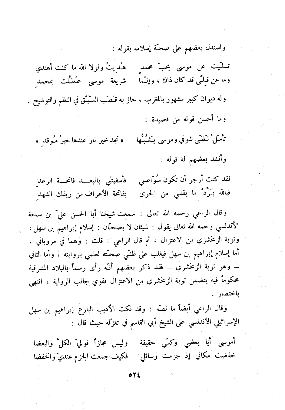 فبالله برّد ما بقلبي من الجوى ... بفاتحة الأعراف من ريقك الشهد وقال الراعي رحمه الله تعالى: سمعت شيخنا أبا الحسن علي بن سمعة الأندلسي رحمه الله تعالى يقول: شيئان لا يصحان: إسلام إبراهيم بن سهل، وتوبة الزمخشري من الاعتزال، ثم قال الراعي: قلت: وهما في مروياتي، أما إسلام إبراهيم بن سهل فيغلب على ظني صحته لعلمي بروايته، وأما الثاني - وهو توبة الزمخشري - فقد ذكر بعضهم أنه رأى رسماً بالبلاد المشرقية محكوماً فيه يتضمن توبة الزمخشري من الاعتزال فقوي جانب الرواية، انتهى باختصار.