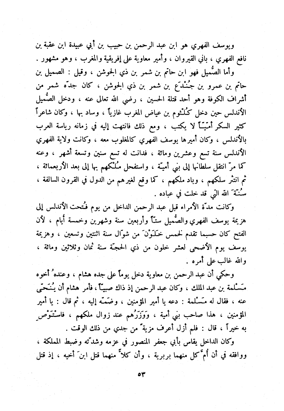 وأما الصميل فهو ابن حاتم بن شمر بن ذي الجوشن، وقيل: الصميل بن حاتم بن عمرو بن جندع بن شمر بن ذي الجوشن، كان جده شمر من أشراف الكوفة وهو أحد قتلة الحسين، رضي الله تعالى عنه، ودخل الصميل الأندلس حين دخل كلثوم بن عياض المغرب غازياً، وساد بها، وكان شاعراً كثير السكر أمياً لا يكتب، ومع ذلك فانتهت إليه في زمانه رياسة العرب بالأندلس، وكان أميرها يوسف الفهري كالمغلوب معه، وكانت ولاية الفهري الأندلس سنة تسع وعشرين ومائة، فدانت له تسع سنين وتسعة أشهر، وعنه كما مرّ انتقل سلطانها إلى بني أمية، واستفحل ملكهم بها إلى بعد الأربعمائة، ثم انتثر سلكهم، وباد ملكهم، كما وقع لغيرهم من الدول في القرون السالفة، سنة الله التي قد خلت في عباده.