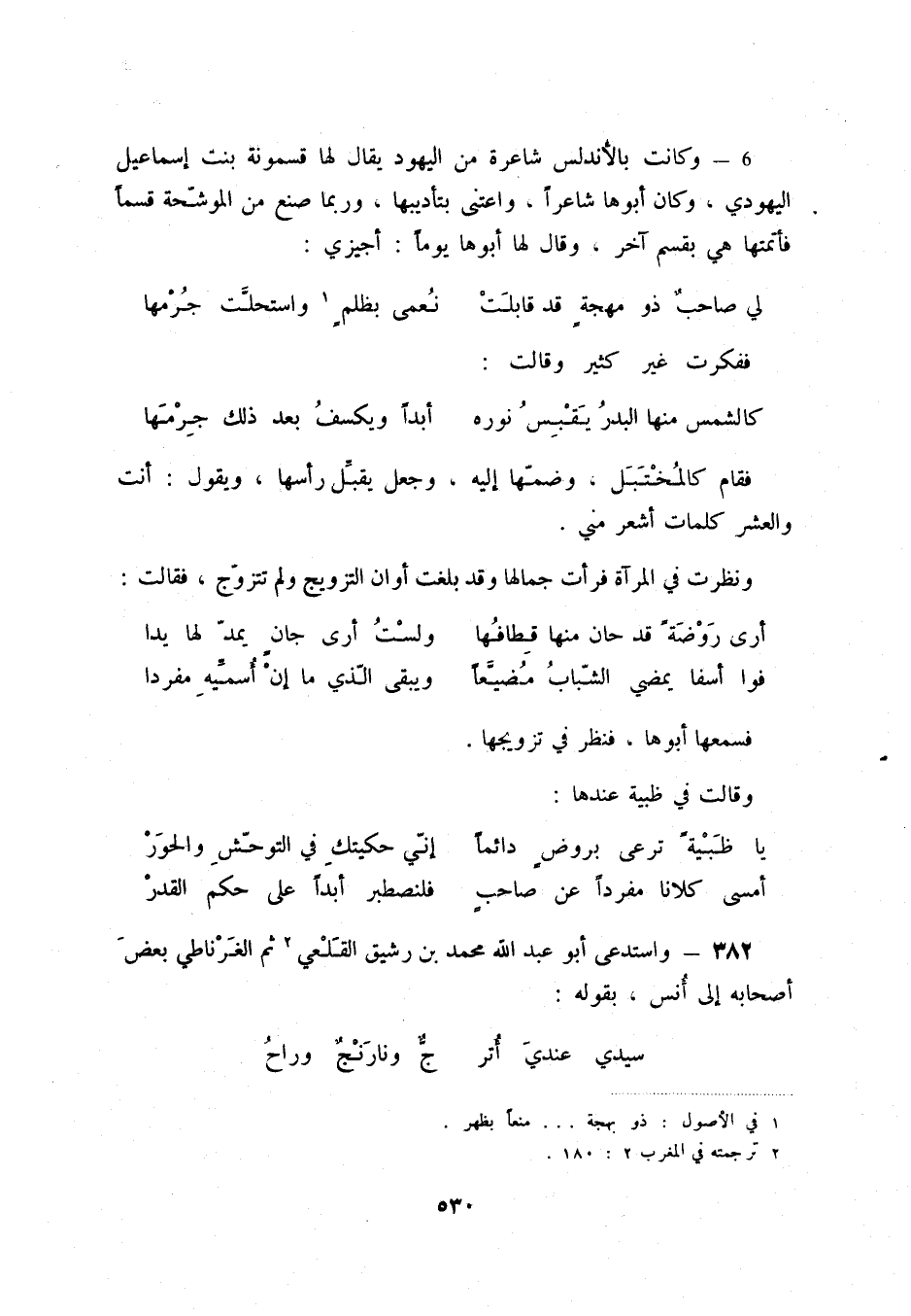 6 - وكانت بالأندلس شاعرة من اليهود يقال لها قسمونة بنت إسماعيل اليهودي، وكان أبوها شاعراً، واعتنى بتأديبها، وربما صنع من الموشحة قسماً فأتمتها هي بقسم آخر، وقال لها أبوها يوماً: أجيزي: