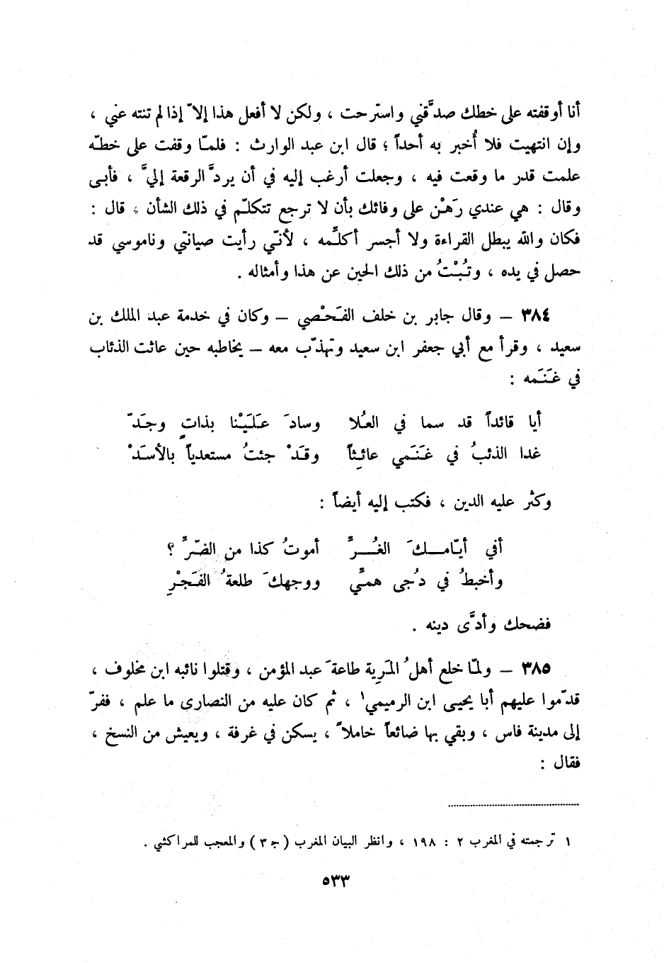 385 - ولما خلع أهل المرية طاعة عبد المؤمن، وقتلوا نائبه ابن مخلوف، قدموا عليهم أبا يحيى ابن الرميمي (1) ، ثم كان عليه من النصارى ما علم، ففر إلى مدينة فاس، وبقي بها ضائعاً حاملاص، يسكن في غرفة، ويغيش من النسخ، فقال: