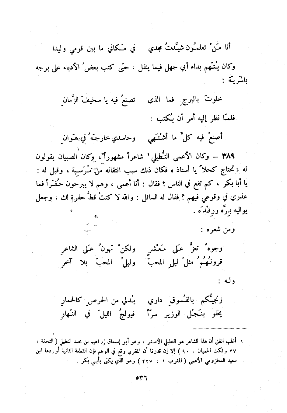 أصنع فيه كلّ ما أشتهي ... وحاسدي خارجه في هوان 389 - وكان الأعمى التطيلي (1) شاعراً مشهوراً، وكان الصبيان يقولون له " تحتاج كحلاً يا أستاذ " فكان ذلك سبب انتقاله من مرسية، وقيل له: يا أبا بكر، كم تقع في الناس فقال: أنا أعمى، وهم لا يبرحون حفراً فما عذري في وقوعي فيهم فقال له السائل: والله لا كنت قط حفرة لك، وجعل يواليه بره ورفده.