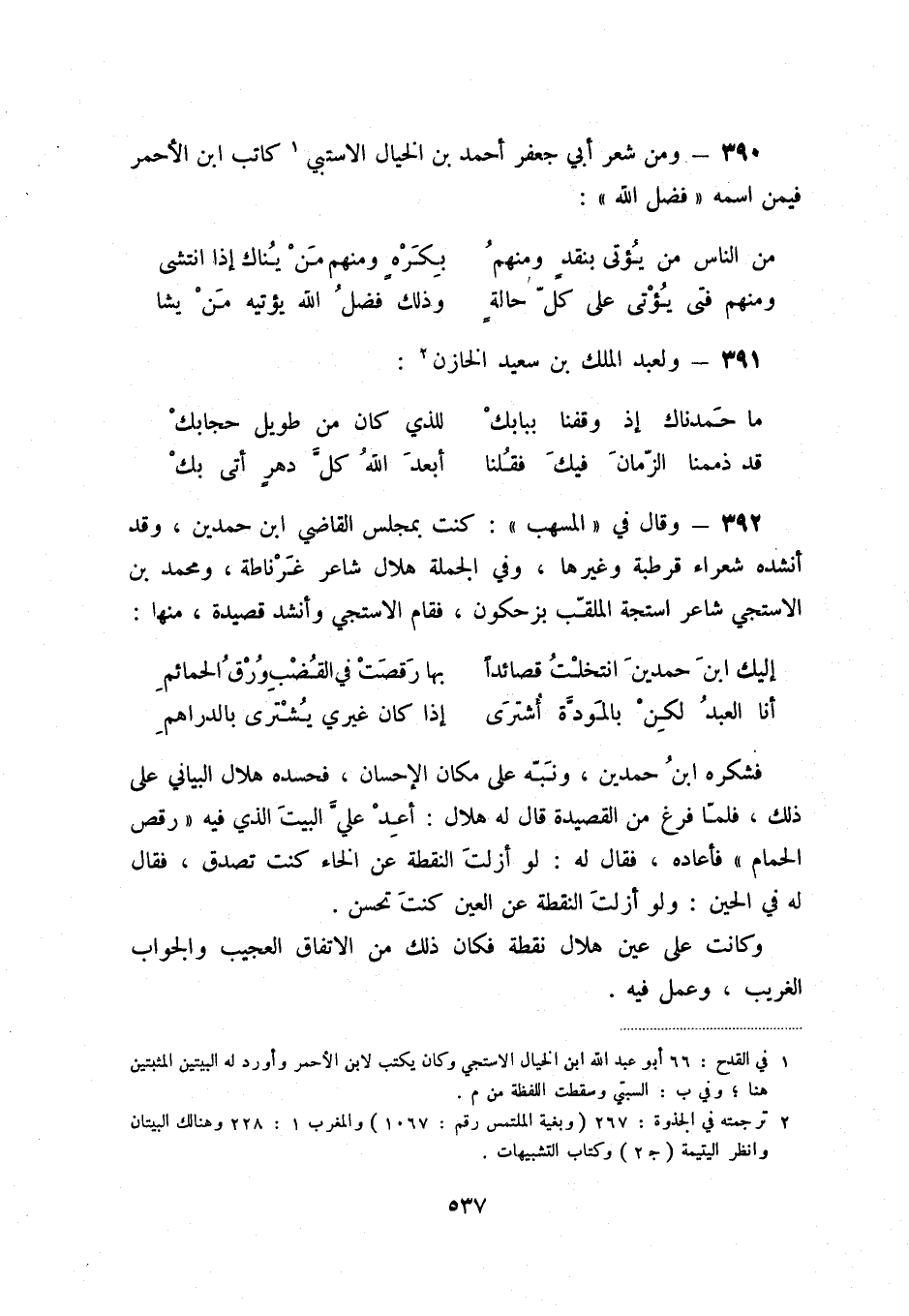 قد ذممنا الزّمان فيك فقلنا ... أبعد الله كلّ دهرٍ أتى بك 392 - وقال في " المسهب ": كنت بمجلس القاضي ابن حمدين، وقد انشده شعراء قرطبة وغيرها، وفي الجملة هلال شاعر غرناطة، ومحمد بن الاستجي شاعر استجة الملقب بزحكون، فقام الاستجي وأنشد قصيدة، منها: