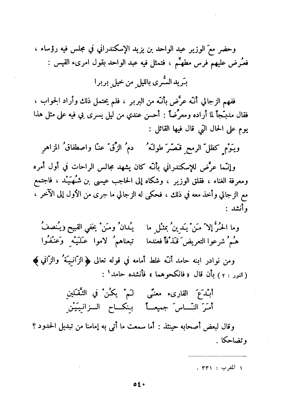 ويومٍ كظلّ الرمح قصّر طوله ... دم الزّقّ عنّا واصطفاق المزاهر وإنما عرض للإسكندراني بأنه كان يشهد مجالس الراحات في أول أمره ومعرفة الغناء، فقلق الوزير، وشكاه إلى الحاجب عيسى بن شهيد، فاجتمع مع الزجالي وأخذ معه في ذلك، فحكى له الزجالي ما جرى من الأول إلى الآخر، وأنشد: