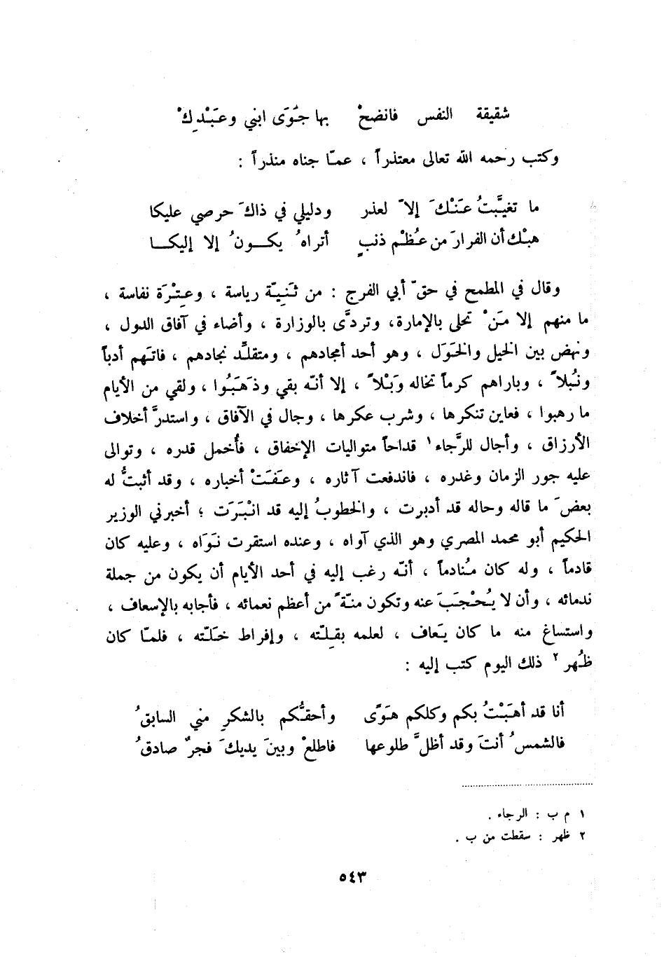 هبك أن الفرار من عظم ذنبٍ ... أتراه يكون إلا إليكا وقال في المطمح في حق أبي الفرج: من ثنية رياسة، وعترة نفاسة، مامنهم إلا من تحلى بالإمارة، وتردى بالوزارة، وأضاء في آفاق الدول، ونهض بين الخيل والخول، وهو أحد أمجادهم، ومتقلد نجادهم، فاتهم أدباً ونبلاً، وباراهم كرماً تخاله وبلاً، إلا أنه بقي وذهبوا، ولقي من الأيام ما رهبوا، فعاين تنكرها، وشرب عكرها، وجال على الآفاق، واستدر أخلاف الأرزاق، وأجال للرجاء (1) قداحاً متواليات الإخفاق، فأخمل قدره، وتوالى عليه جور الزمان وغدره، فاندفعت آثاره، وعفت أخباره، وقد أثبت له بعض ما قاله وحاله قد أدبرت، والخطوب إليه قد انبرت، أخبرني الوزير الحكيم أبو محمد المصري وهو الذي آواه، وعنده استقرت نواه، وعليه كان قادماً، وله كان منادماً، أنه رغب إليه في أحد الأيام أن يكون من جملة ندمائه، وأن لا يحجب عنه وتكون منةً من أعظم نعمائه، فأجابه بالإسعاف، واستساغ منه ما كان يعاف، لعلمه بقلته، وإفراط خلته، فلما كان ظهر (2) ذلك اليوم كتب إليه: