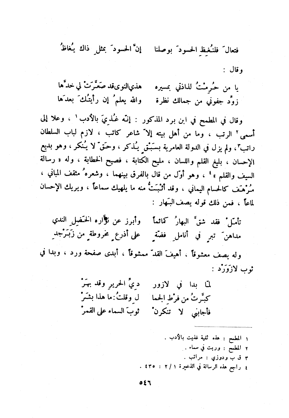 زوّد جفوني من جمالك نظرة ... والله يعلم إن رأيتك بعدها وقال في المطمح في ابن برد المذكور: إنه غذي بالأدب (1) ، وعلا إلى أسمى (2) الرتب، وما من أهل بيته إلا شاعر كاتب، لازم لباب السلطان راتب (3) ، ولم يزل في الدولة العامرية بسبقٍ يذكر، وحق لا ينكر، وهو بديع الإحسان، بليغ القلم واللسان، مليح الكتابة، فصيح الخطابة، وله " رسالة السيف والقلم " (4) ، وهو أول من قال بالفرق بينهما، وشعره مثقف المباني، مرهف كالحسام اليماني، وقد أثبت منه ما يلهيك سماعاً، ويريك الإحسان لماعاً، فمن ذلك قوله يصف البهار: